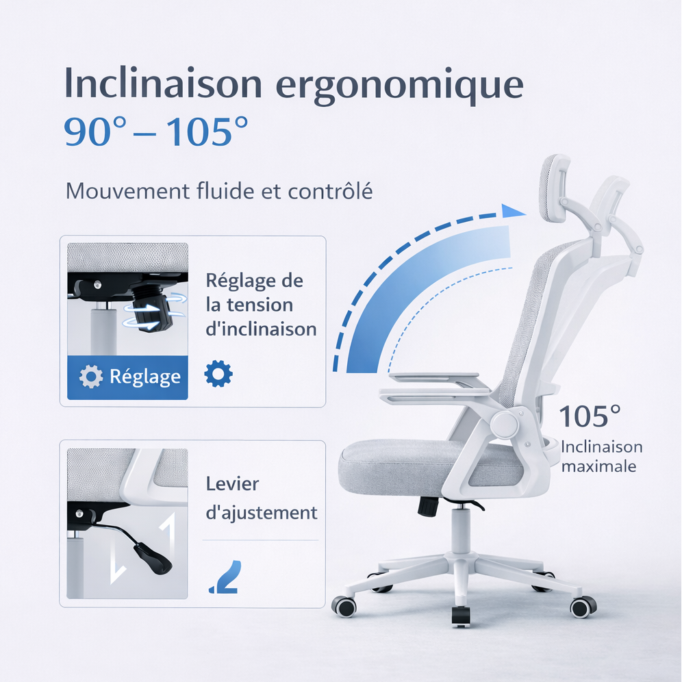 Profitez d’un mouvement fluide et maîtrisé de 90° à 105°, conçu pour accompagner naturellement votre posture.